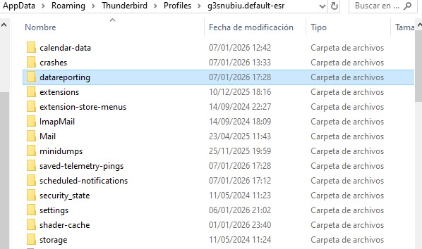 Este archivo puede ignorarse porque como su nombre lo indica es un reporte y antiguo: 1764189287131.706c0a04-aa31-4173-b29f-b2d220526bf5.main.jsonlz4, ubicado en la ruta C:\Users\Usuario\AppData\Roaming\Thunderbird\Profiles\g3snubiu.default-esr\datareporting\archived\2025-11.