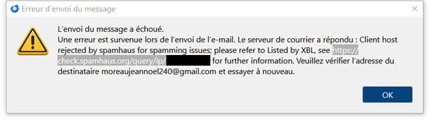 L’envoi du message a échoué. Une erreur est survenue lors de l’envoi de l’e-mail. Le serveur de courrier a répondu : Client host rejected by spamhaus for spamming issues; please refer to Listed by XBL, see https://check.spamhaus.org/query/ip/xx.xxx.xxx.xxx for further information. Veuillez vérifier l’adresse du destinataire xxxx