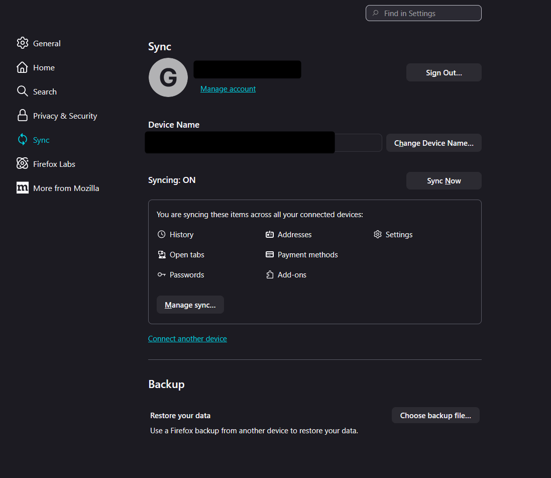 On the "Your Firefox has updated" page, I recently found out that in addition to Firefox Sync, you can also create a backup in the form of a local file. When I try to follow the instructions on the support page for the function (here I get stuck. For some reason I am only allowed to choose a file to restore my data, but I am not allowed to create a new backup. I have tried refreshing Firefox and even creating a new profile, but both have the same issue. I am not seeing a "manage backup" button either (see screenshot).