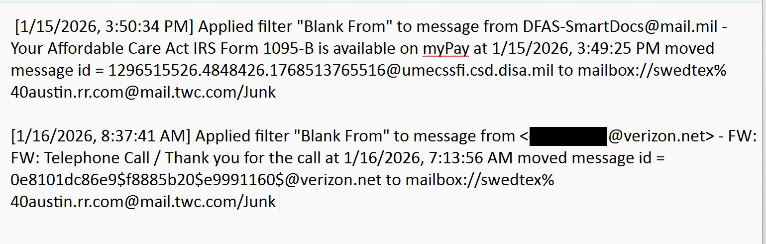It only affects some emails, mostly from institutions but also from a couple of individuals. Most personal emails come thru fine. Attached screen shots of filter (I believe this is a Thunderbird "stock" filter?) and two sample log entries.