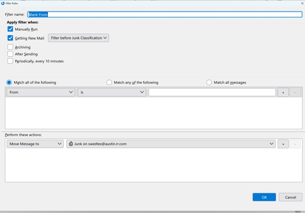 The "Blank From" filter in Thunderbird is filtering valid emails that are showing a valid from name.