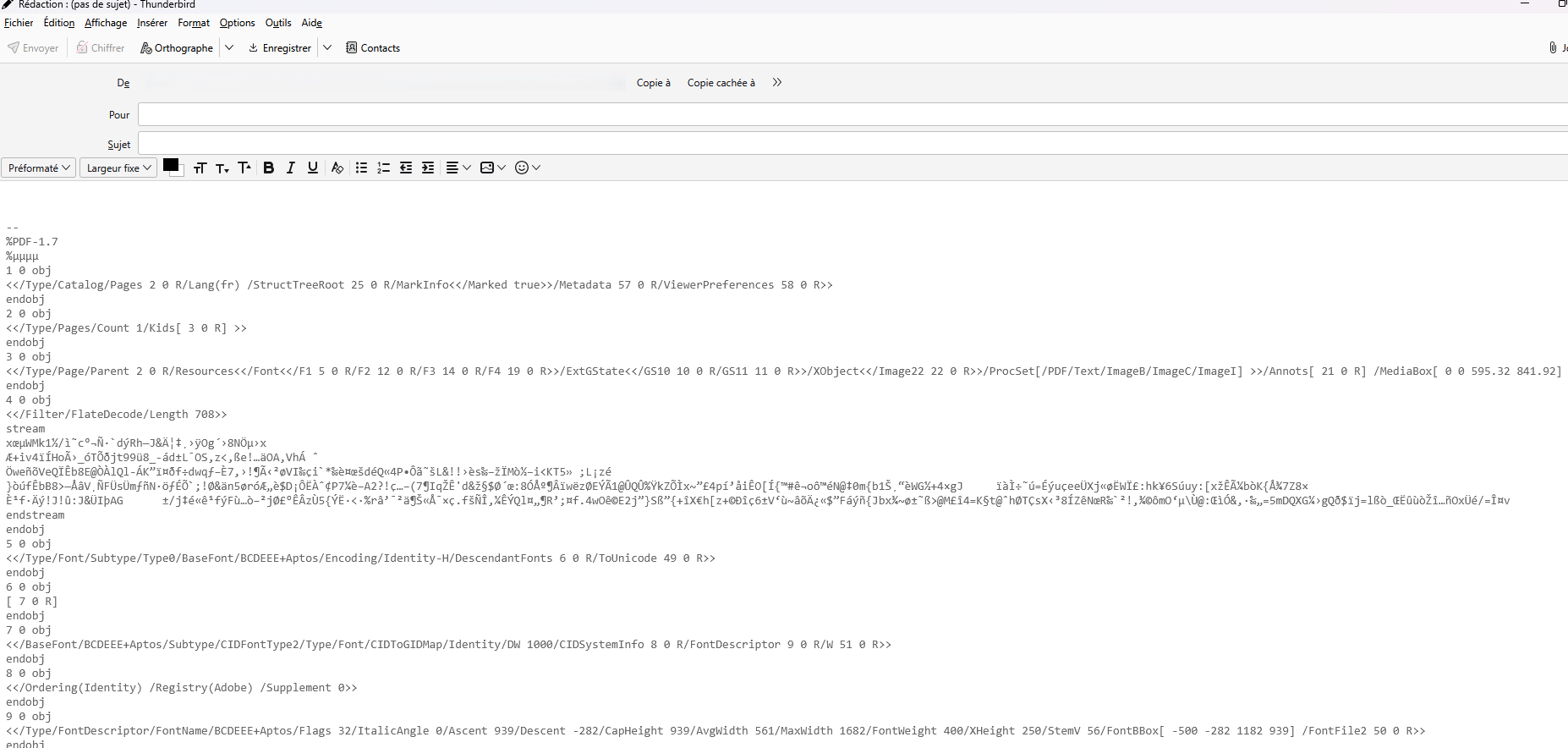 Hi, Any new message I create in Thunderbird is covered with pages of uncomprehensible characters which I need to delete before starting to write my text