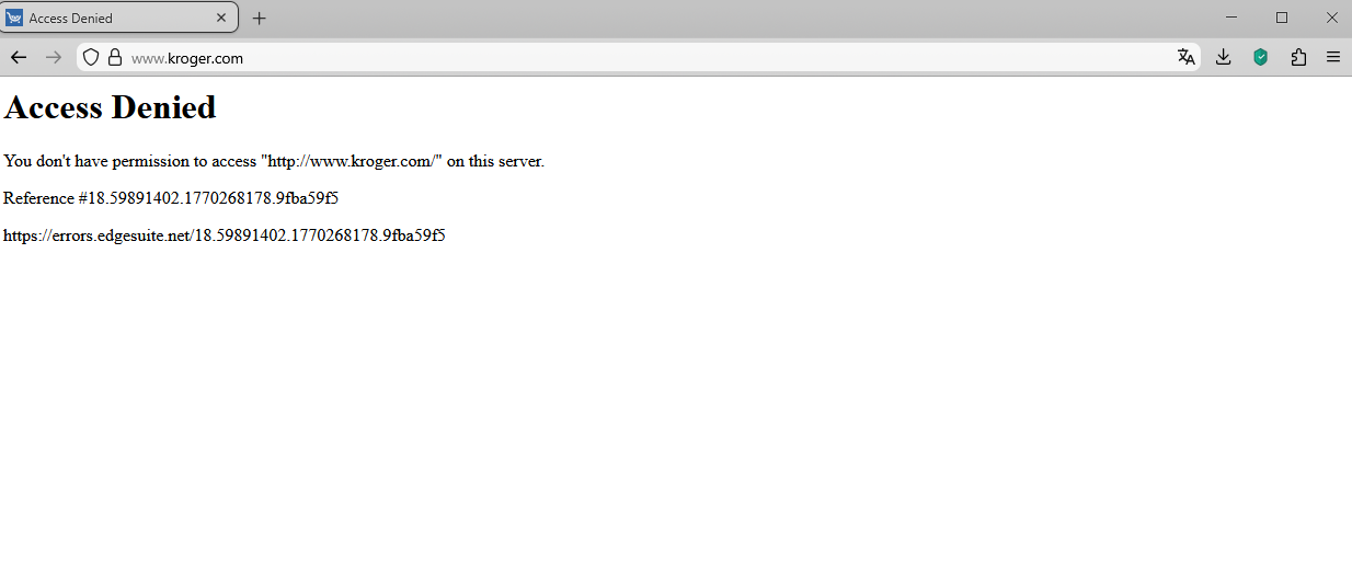 Just downloaded an update and this error message appears: You don't have permission to access "http://www.kroger.com/" on this server. Reference #18.a9423917.1770250884.86f3e1c1 https://errors.edgesuite.net/18.a9423917.1770250884.86f3e1c1 I have tried 9 times to reach kroger.com and get this every time.