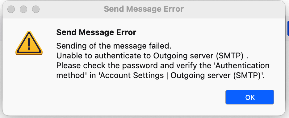 Oh gosh I hadn't realised that screenshot showed my details. I've now deleted it, and please delete my user name from your post, I'd appreciate it. I've tried your suggestion but it didn't work, I got the same notif. as before (ie.it failed with my email address as a user name), plus the one I'm attaching now (Send message error). I entered the same password as it shows on the Saved logins settings, and the Authentication method is Normal, as it used to be (and as it is with my other email addresses).