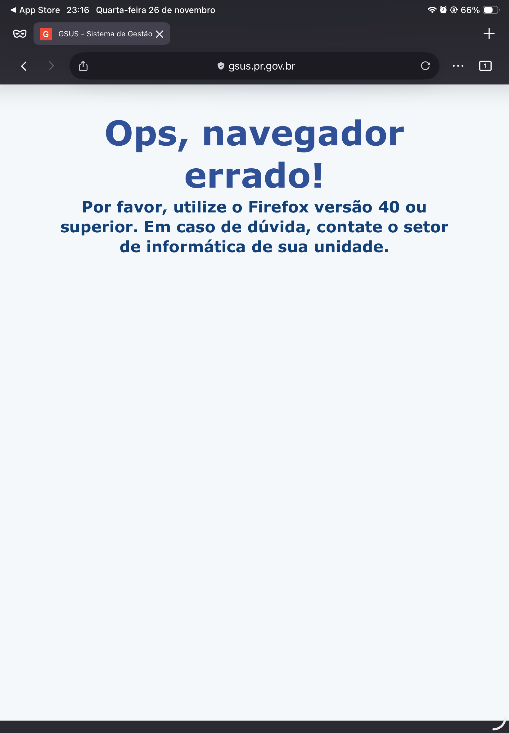 Recentemente comecei a utilizar o sistema IOS e IpadOs e percebi que o navegador Firefox impossibilita a utilização do GSUS, é um site usado para acesso a prontuários hospitalares, o mesmo pode ser acessado em Android, Windows, MacOS, Linux, etc por meio do website, a única exceção está sendo IOS e IpadOs, queria saber se é alguma configuração do aplicativo em dispositivos com esse sistema, ou se é alguma barreira do sistema operacional em si. Grato!