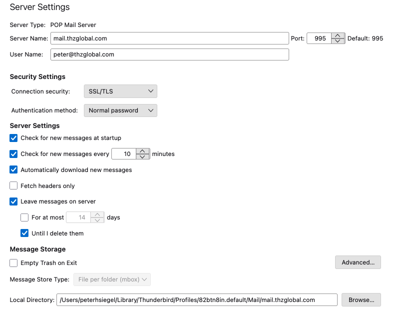 This appears to be situation where you need specific setup from the web host email provider. Did you try pop.thzglobal.com? What is the recommendation from the email provider?