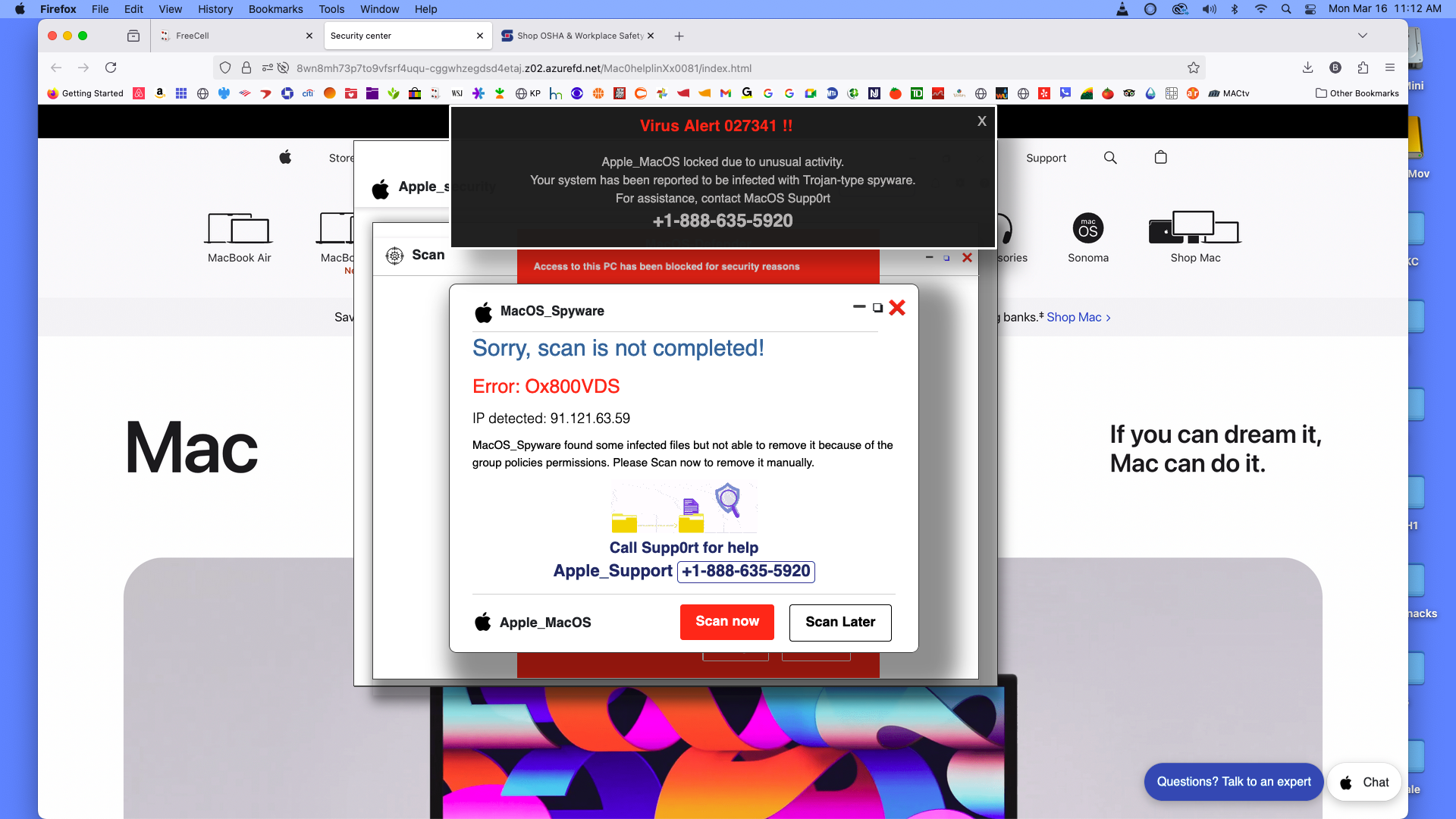 Sporadically over the past year, a virus warning, purportedly from Apple, has locked my FireFox screen. I must Force Quit to unlock FoxFire. See images. Is this a scam?
