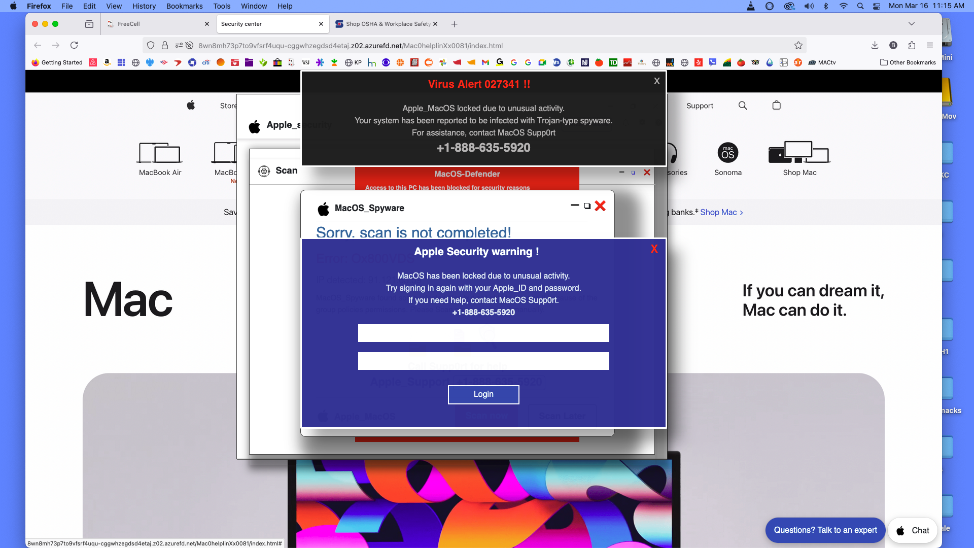 Sporadically over the past year, a virus warning, purportedly from Apple, has locked my FireFox screen. I must Force Quit to unlock FoxFire. See images.