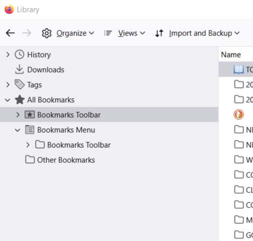 4. BUT: No bookmarks appear in the TOOLBAR where they’ve resided comfortably for years . . .