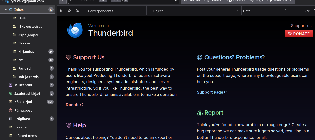 I opened Thunderbird and could not get to the inbox or any other folders—it shows only the donations page. This is not okay. I do donate. Not much, not too often, but I do. However, if I open e-mail client and want to use it, then this is not a right moment to asking for donations. Or I should be able to do what I came to do and deal with donations issue later.