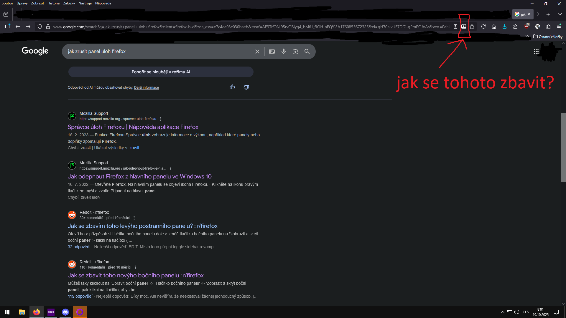 Možnosti řešení: Vypnout integraci s Windows taskbarem Do adresního řádku Firefoxu napiš: about:config Potvrď varování. Vyhledej klíč: browser.taskbar.lists.enabled Dvojklikem nastav hodnotu na false.