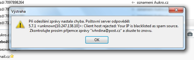 Vážený pane! Problém jsem vyřešil odpojením a znovu připojení k poskytovateli internetu - změnou dynamické IP adresy. Odesílaní zpráv z webového rozhraní fungovalo vždy. Odesílání z rozhraní Thunderbirdu někdy nefungovalo. Vzhledem k tomu, že pravidelně vypínám zařízení pro připojení k internetu v nočních hodinách, dochází po každém zapnutí ke změně dynamické IP adresy. Po konzultaci s poskytovatelem je logickým závěrem, že některé IP adresy přidělované mi poskytovatelem jsou vedeny na (Blacklistu) serveru Thunderbirdu jako problematické stran šíření SPAMU a vzhledem k fungujícím mechanismům se jejich počet navyšuje. S tímto pak logicky roste pravděpodobnost, že mi při opětovném zapnutí poskytovatel přidělí IP adresu vedenou na Blacklistu u Vás. Jako nevinný mám tedy problém s Vámi a nikoliv s poskytovatelem připojení. Je tedy rozumné blokovat dynamické adresy ze kterých se šíří SPAM? Ve finále pak dojde logicky k tomu, že na Vašem Blacklistu bude vedena kompletní číselná řada a z Thunderbirdu nepůjde odeslat žádná zpráva.