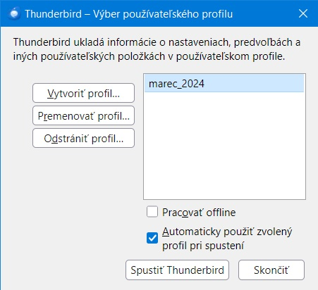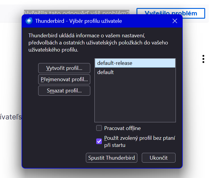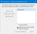Ne, nepomohlo to, ten druhý profil to vůbec neakceptuje, nevím proč. Končím, jsem s nervy po třech dnech na konci a vyzkoušel jsem opravdu všechno, udělal jsem minimálně třicet nových instalací a vždy začal znovu s jiným profilem, nic nepomáhá. Je to škoda, ještě v létě jsem instaloval moje PC a instalace za pár vteřin a obnova zálohy rychlosti blesku, stačil Thunderbird jen znovu startovat a bylo vyřešeno. Až budete mít civilizované řešení, dejte mi vědět, do té doby se mujsím spojit se seznamem.cz a s googlem a uvidíme co dál.