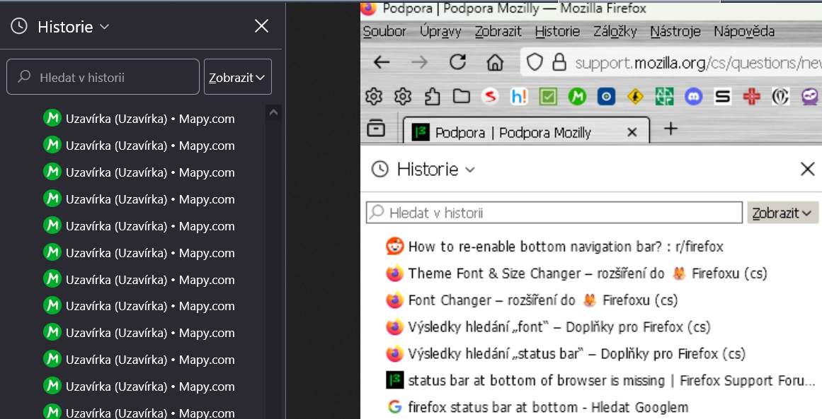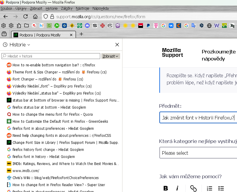 Výpomoc AI: # Jak změnit písmo (velikost a typ) v uložené Historii ve Firefoxu 144 pomocí userChrome.css (u v. 140 to bude asi stejné) 1) Povolit načítání userChrome.css: Otevři about:config, najdi toolkit.legacyUserProfileCustomizations.stylesheets a nastav ho na true. Poté Firefox restartuj. 2) Najít profil a vytvořit soubor: Otevři about:profiles. U aktivního profilu klikni na Open Directory. V této složce vytvoř podsložku chrome a do ní ulož soubor userChrome.css (prostý text, UTF-8). 3) Vlož tento kód do userChrome.css: .sidebar-placesTreechildren::-moz-tree-cell-text { font-family: "Segoe UI", Tahoma, Arial, sans-serif !important; font-size: 14px !important; font-weight: 400 !important; line-height: 1.15 !important; } .placesTreechildren::-moz-tree-cell-text, .placesTreechildren treechildren::-moz-tree-cell-text { font-family: "Segoe UI", Tahoma, Arial, sans-serif !important; font-size: 14px !important; font-weight: 400 !important; line-height: 1.15 !important; } .sidebar-placesTreechildren, .placesTreechildren { font-variant-ligatures: none !important; } /* Příklad pro menší text .sidebar-placesTreechildren::-moz-tree-cell-text { font-size:12px !important; font-family:"DejaVu Sans",sans-serif !important; }4) Restartuj Firefox: Po uložení restartuj prohlížeč. Pokud se změna neprojeví, zkontroluj, že je povoleno toolkit.legacyUserProfileCustomizations.stylesheets a že soubor je ve správném profilu (.../profile/chrome/userChrome.css). 5) Tipy pro ladění: - Máš-li více profilů, ujisti se, že upravuješ ten správný (about:profiles). - Zkus testovací extrémní hodnoty (např. font-size: 30px; background: yellow;) – poznáš, jestli se úprava načítá. - Pokud ne, můžeš přes Browser Toolbox zjistit aktuální selektory.