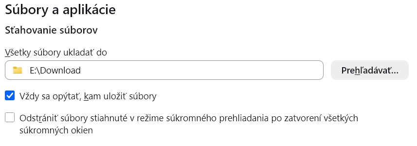 Mám volbu: U každého souboru se zeptat na místo uložení. Ale je to nefunkční, firefox stále ukládá do složky "Stažené soubory"