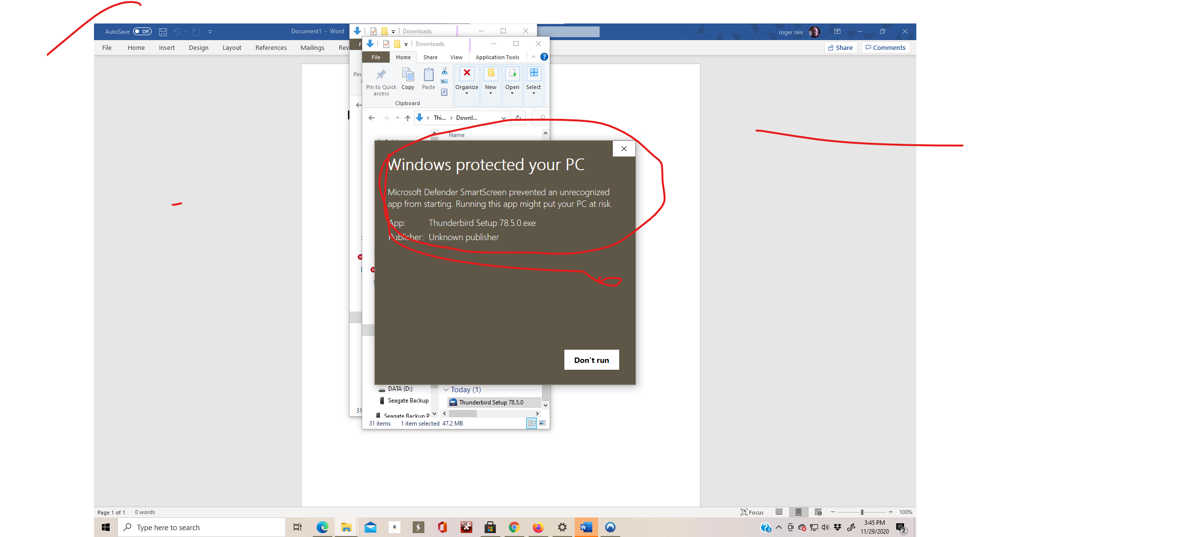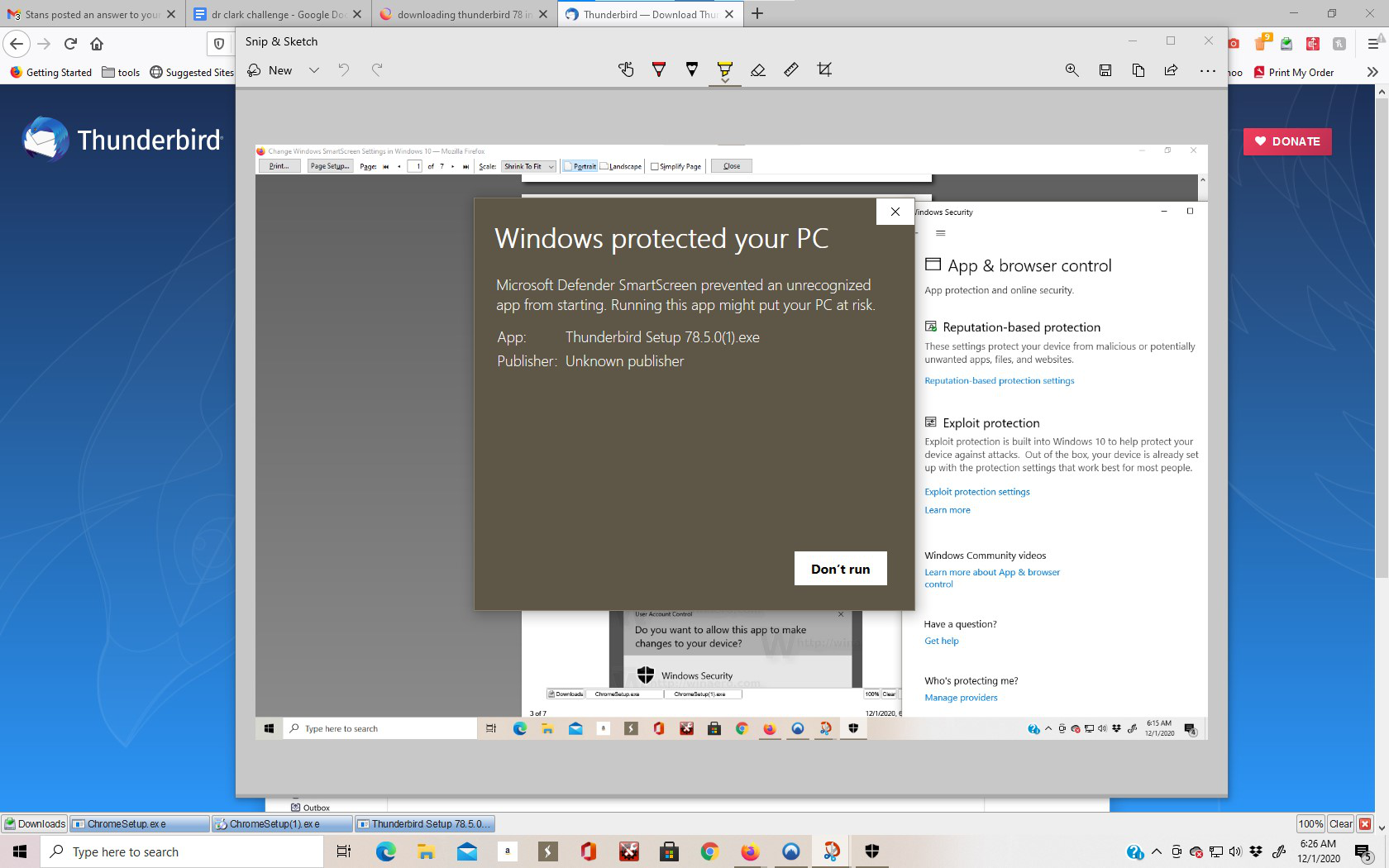 My best guess is you downloaded Thunderbird from an obscure source, and Windows Smart Screen is blocking the download because the file has not been seen yet.