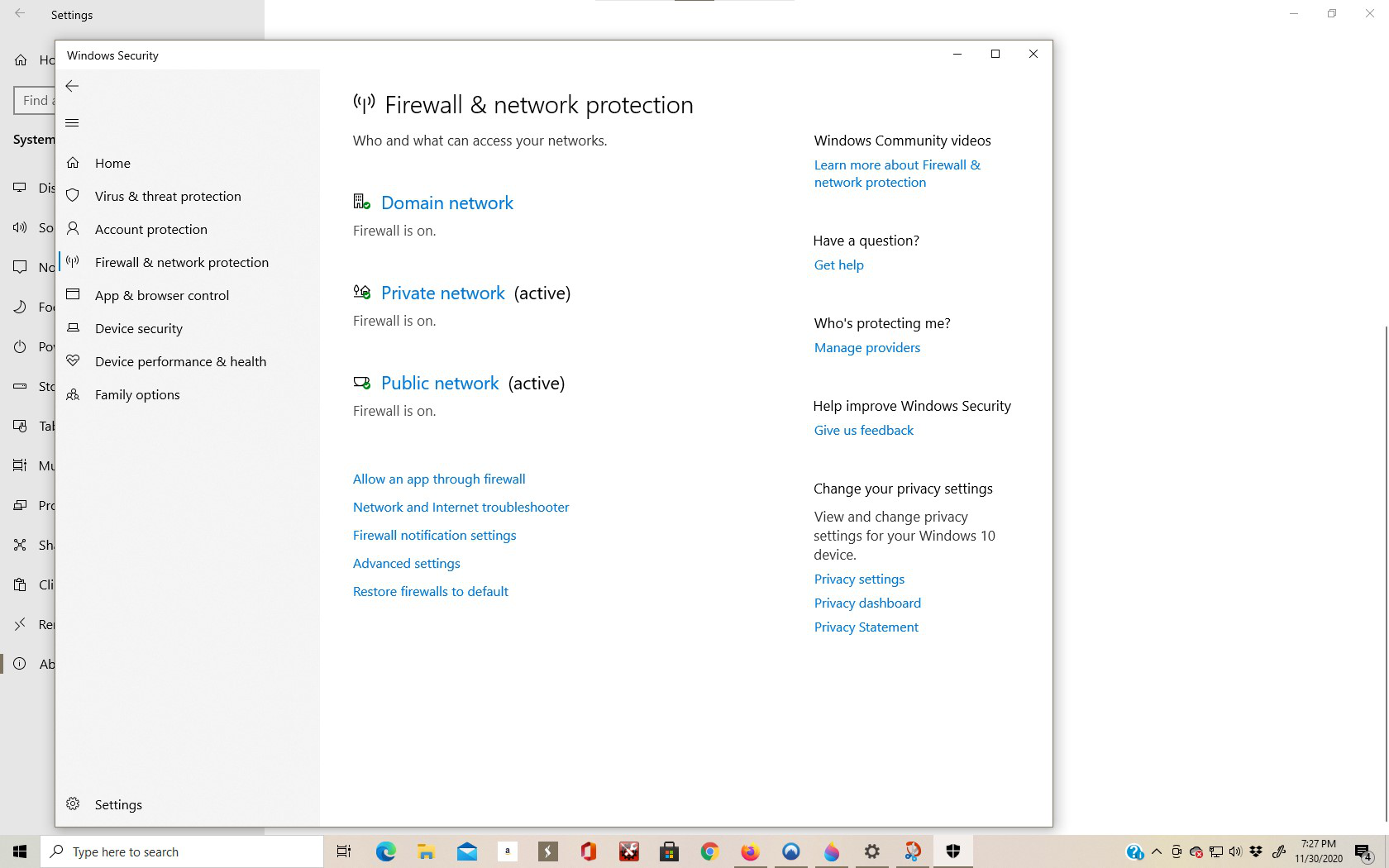I've attached a couple of screen shots , it seems I have Windows 10 Home, on the security screen shot i highlighted a couple of things. when I go to "add a app" I can see where Mozilla is authorized for "private" not "Public"