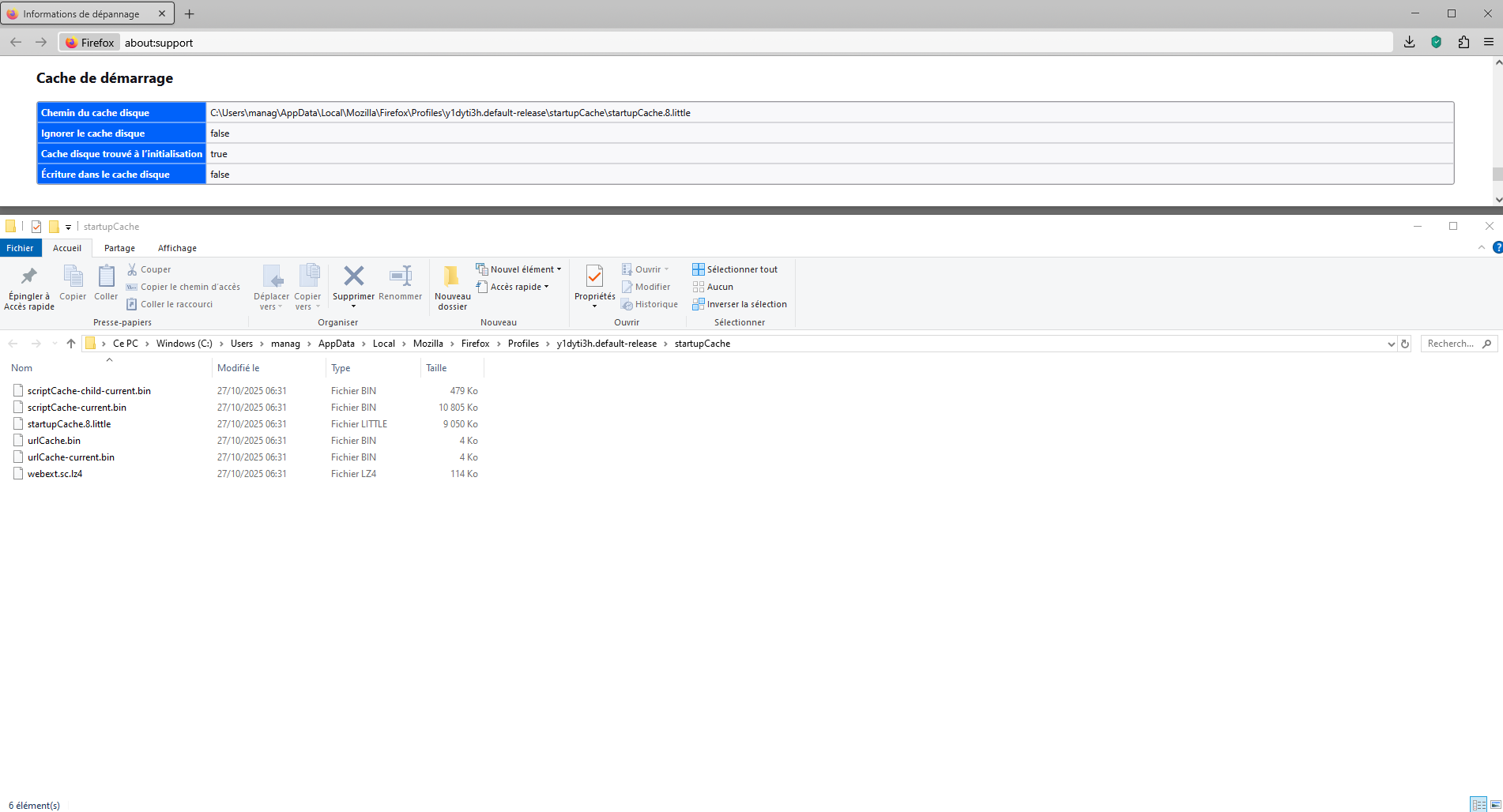 Saisir about:support dans la barre d’adresse. Dirigez-vous vers Cache de démarrage. Dirigez-vous vers votre dossier startupCache. Arrêtez Firefox. Supprimez le contenu du dossier startupCache. Démarrez Firefox.