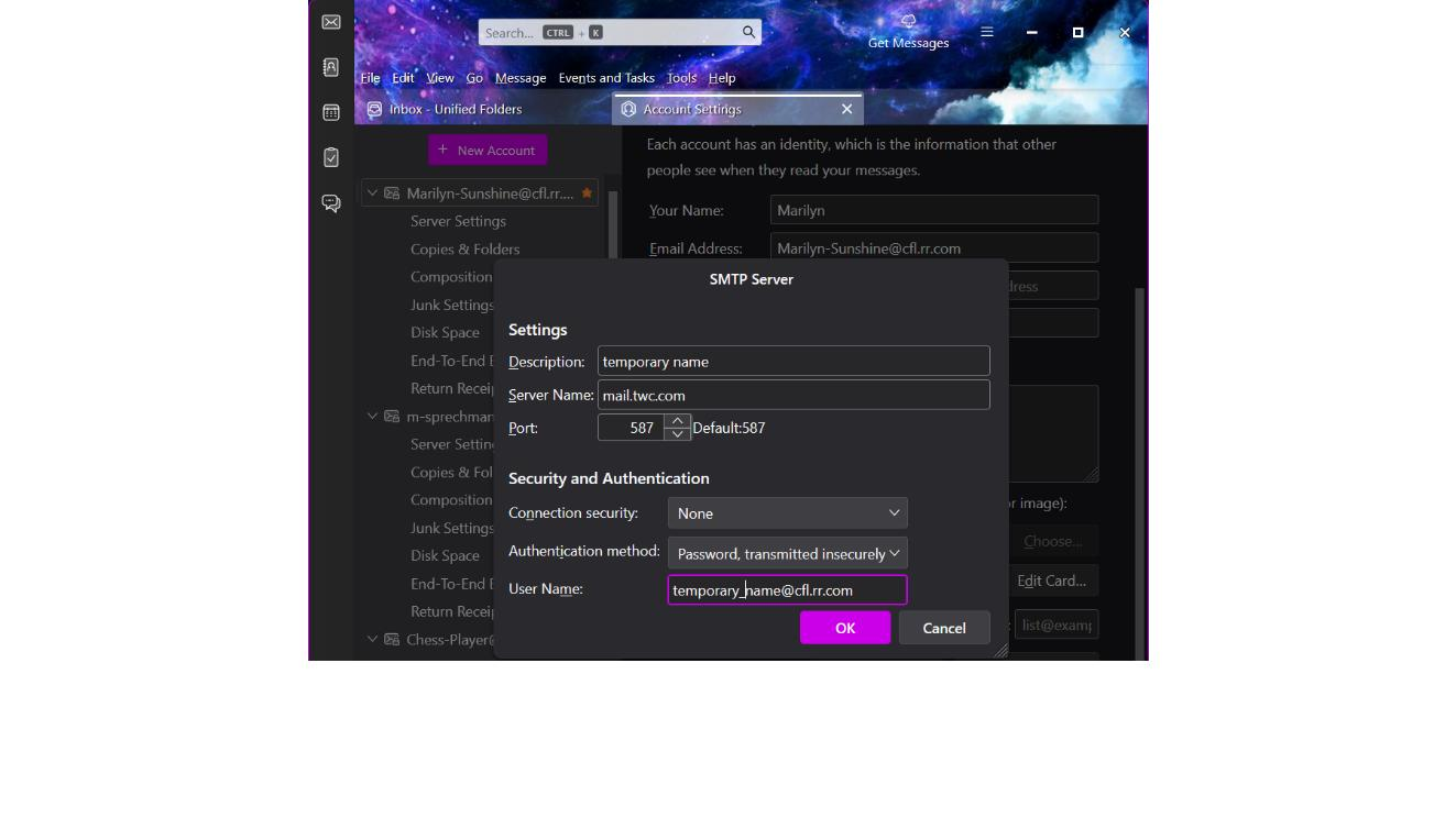Thank you so much, Toad-Hall! Hopefully, this worked -- that a password is being required. Until Spectrum made their changes, everything was fine. If I added an account and input the wrong password, Thunderbird asked me for the right one; that's how I know passwords had previously been required. All of my accounts are now set according to what you sent me. After I made the change, I checked my incoming mail settings; they also matched your material.