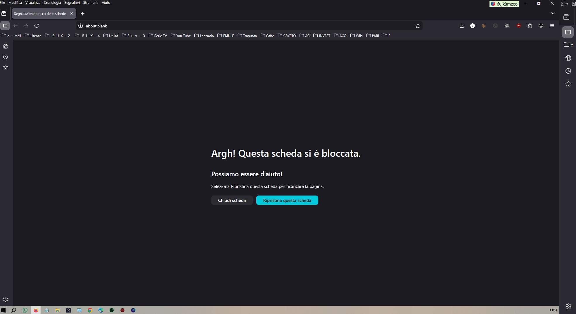 Buongiorno, spesso, ma non sempre, quando cerco di aprire un link in una nuova pagina o in una nuova finestra, compare una pagina con il messaggio in oggetto (vedere allegato). La stessa cosa ae utilizzo uno dei preferiti. Il problema raramente si risolve con il comando "Ripristina questa scheda" ma devo ripovare più volte di seguito e ogni tanto non funziona proprio. Questo problema non si verifica utilizzando chrome per cui penso sia un problema di firefox. Il problema sembra associato all'antivirus Bitdefender poichè saltuarimente, in modo casuale , mi compariva un popup di errore 0xc0000142 del modulo Analysecrash.exe del programma che ho risolto usando l'opzione "Esegui come amministratore" nelle impostazioni di Analyzecrash.exe. Potreste darmi qualche indicazione su come risolvere questo problema? Grazie