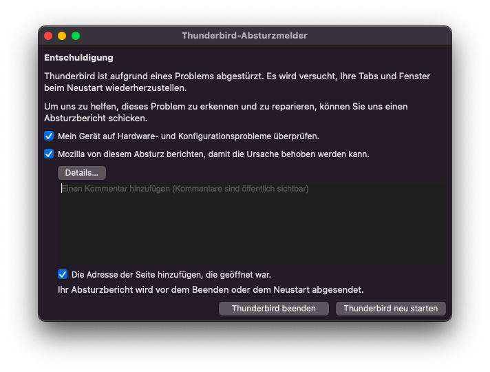 Ich habe Thunderbird auf meinem MacBook Air von Anfang 2015 geladen auf dem MacOS Monterrey läuft. Sobald ich einen eMail Account einrichten möchte stürzt Thunderbird ab. Was muss ich tun, um diese Abstürze zu vermeiden?