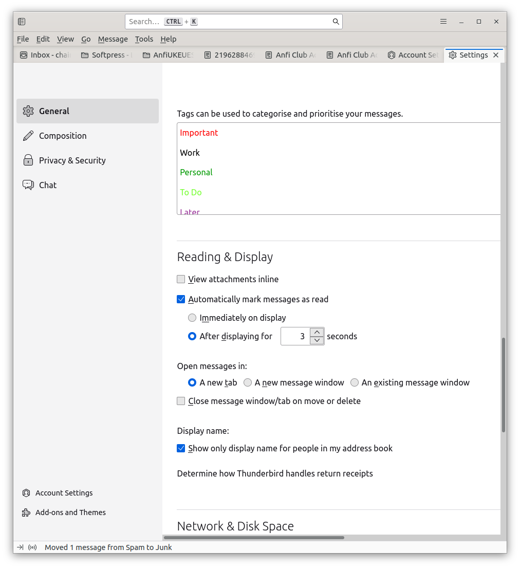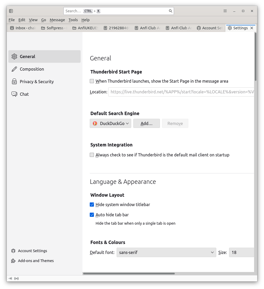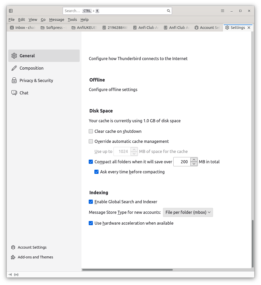 Just updated from Ubuntu 20 to 24. Seems Thunderbird has not been auto-updating. I have three email accounts, each with multiple folders and sub-folders. I have three windows open, one for each account because they are for three purposes. Before the change each full height window could accommodate all the folders for its account (plus the un-expanded two lines for the other accounts). Now the folder lines are further apart and they don't fit so I can't tell when a new message arrives in one of the other accounts. Is there a setting for the spacing of the folder listing, and if so, what is it? Similarly I can not see so many messages listed in the classic layout without enlarging that pane and reducing the space for the messages. The spacing is larger than it used to be. Does it have a setting?