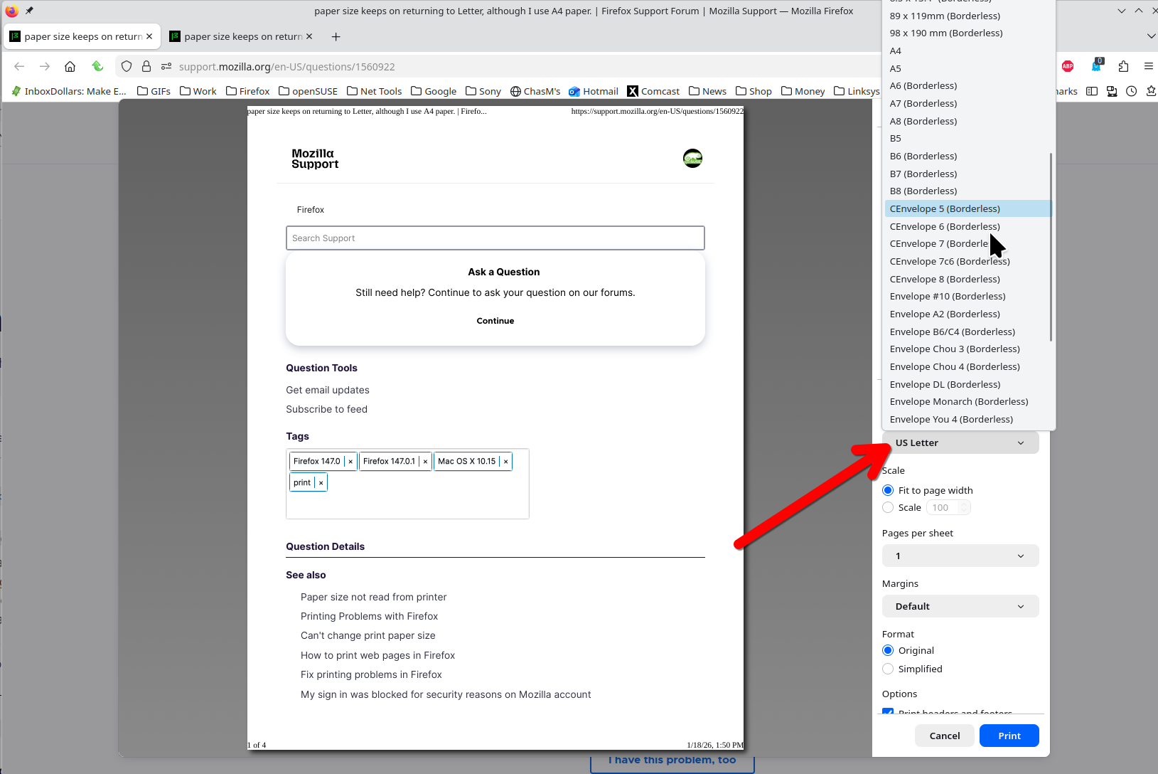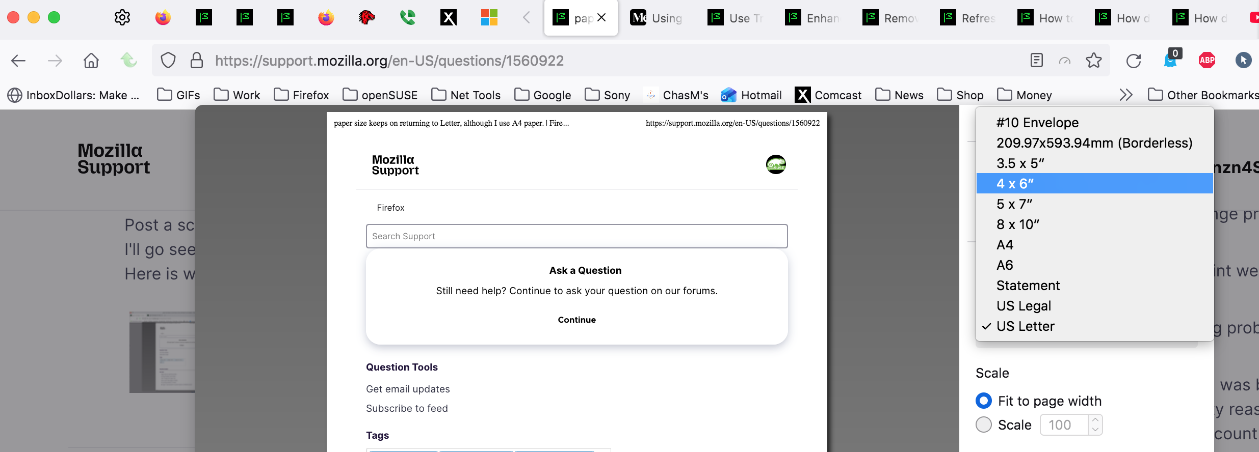 It would be easier to understand if there was actually a paper size setting, but there isn't. The alternative of changing settings on three different printers to get back to A4 seems ridiculous to me and I don't have 3 printers to circulate among. Why is Mozilla convinced everyone wants Letter size as default? Sorry about the grumps, but there you are.