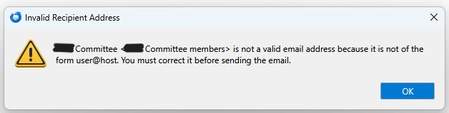 - Committee <*** Committee members> is not a valid email address because it is not of the form user@host. You must correct it before sending the email. (Name partially starred out for security).