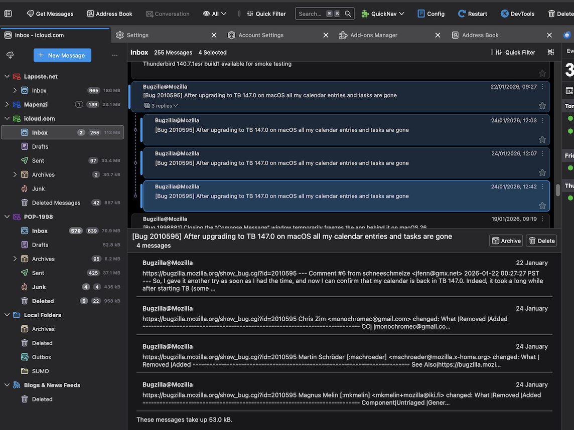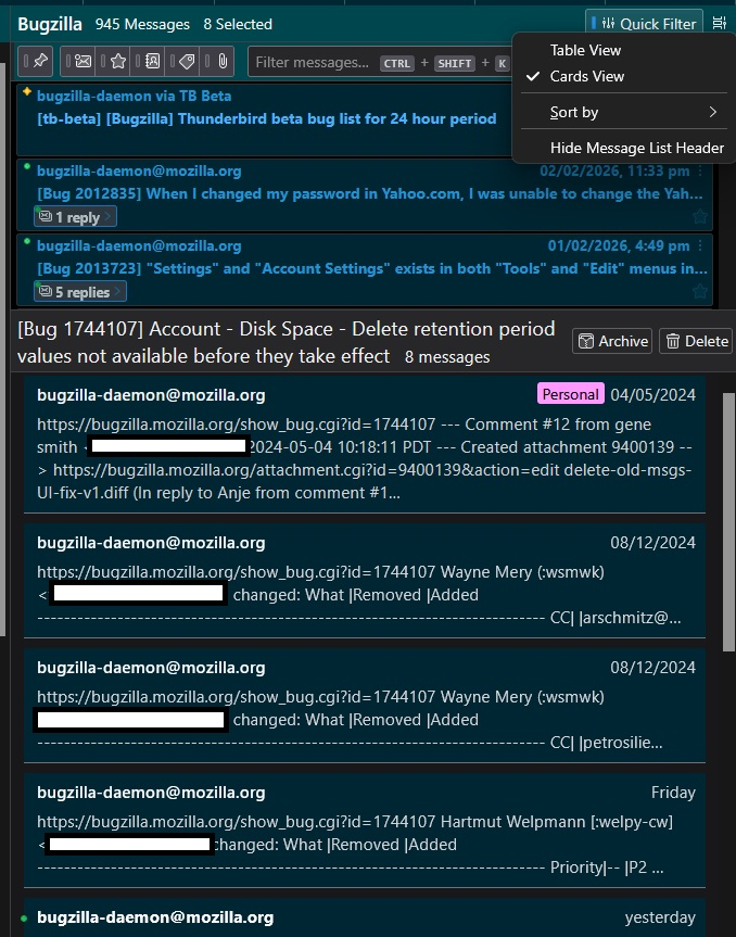 When using Thunderbird 140 I am able to setup the background color of the message pane for individual messages. However when the messages are threaded, the message pane shows a preview of all of the threaded messages together in the message pane with a different background color than individual messages.
