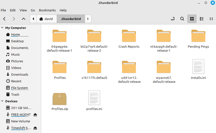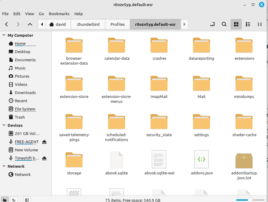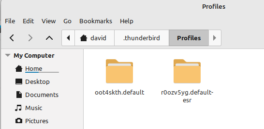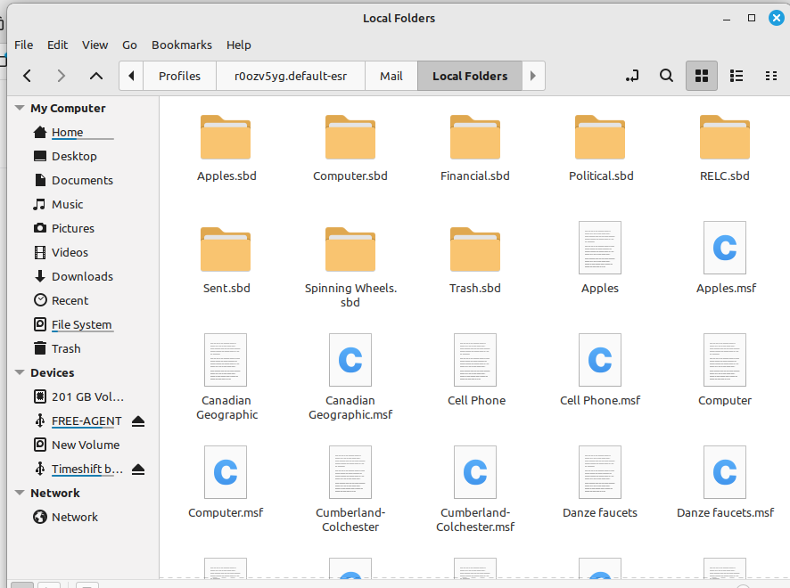 I think I understand the concept of replacing the currently active profile with a different one, by simply dropping the old one on top of the current one. What is not clear to me is how to do this. Tell me whether these images help. The first one is the files under Home/David/.Thunderbird. The bt2p7ny9.default-release-2 folder is what is currently being used by TB as its profile. The five other xxxxxxxxx.default release folders consist of 2 containing Mail folders, (with recent emails), and 3 which do not. (I do not know what these folders do, and have not asked.) Now you will note on this first screen also, a folder named "Profiles". Moving to this folder, (so we are now down at Home/David/.Thunderbird/Profiles), we get the second image. The oot4skth.default folder has no Mail folder in it. But the r0ozv5yg.default-esr has a number of folders, including one labelled Mail. (Third image). Within this folder there are two folders: Local Folders and pop.chebucto.ns.ca. (Fourth image). The Local Folders contains all the old emails, divided by the folder structure within the T-B program, (the menu which displays down the left side of the screen) (the 5'th image)(Is there any point in asking why some of these are folders, and others simple files...?); the other one is named after my email provider, and looks to hold the contents of the Inbox at the time the connection got broken. Have I provided you with what you need to direct me as to what I need to do, to get T-B hitched back up to my email as it was before I rolled things back? As I say, I do not understand the workings of T-B, but it would seem to me that T-B simply has a pointer to its currently active profile, and what I need to do is simply update that pointer to the r0ozv5yg.default-esr, rather than its current bt2p7ny9.default-release-2. But it appears that my innocent analysis is much more simplistic than the actuality. If I were to copy the entire contents of r0ozv5yg.default-esr, and simply paste them onto bt2p7ny9.default-release-2, would that resolve my issue?? Or what should I be doing? (And I am sorry if I come across as excessively wordy. Are the screen shots of File structure any better? Some other format? Any other things I can do? It is frustrating: I can see the old messages in raw form in the files, but I cannot get at them using T-B, (which holds the means of displaying them). But I am most grateful to you for your patient guidance, even if I am not explaining myself properly.