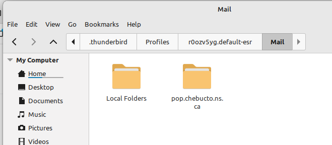 Going into the .Thunderbird directory, (Home/David/.Thunderbird), I get 5 more files labelled "xxxxxxxxx.default-release", two of which have "Mail" folders within them, (but none of them have anything more than recent emails). But in addition to these 5 "default release" folders, (at the .Thunderbird level), there is a folder "Profiles", and within *this* there are 2 folders: oot4skth.default and r0ozv5yg.default-esr. The first of these does not have any folder called "Mail". The second one is the gold: in the Mail folder there are two folders: "Local Folders" and "pop.chebucto.ns.ca". The first of these contains all the emails accumulated over years, divided into the folders in my TB install, and the second looks to be the contents of the inbox at the time when my system went south. What I am trying to do is get these two folders in the .Thunderbird/Profiles folder to be the current default profile, OR move the contents of the folders under the Profiles folder into the current default profile.