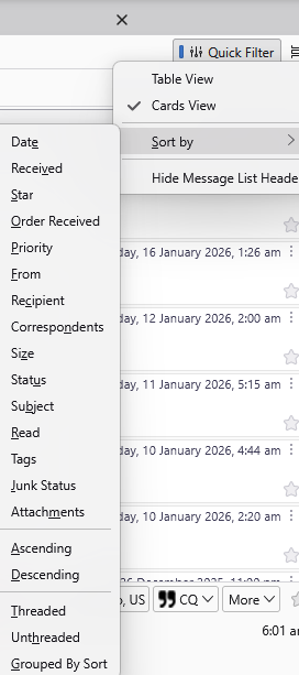 How do I select for a given folder of emails the display of them by date with the latest on the bottom.
