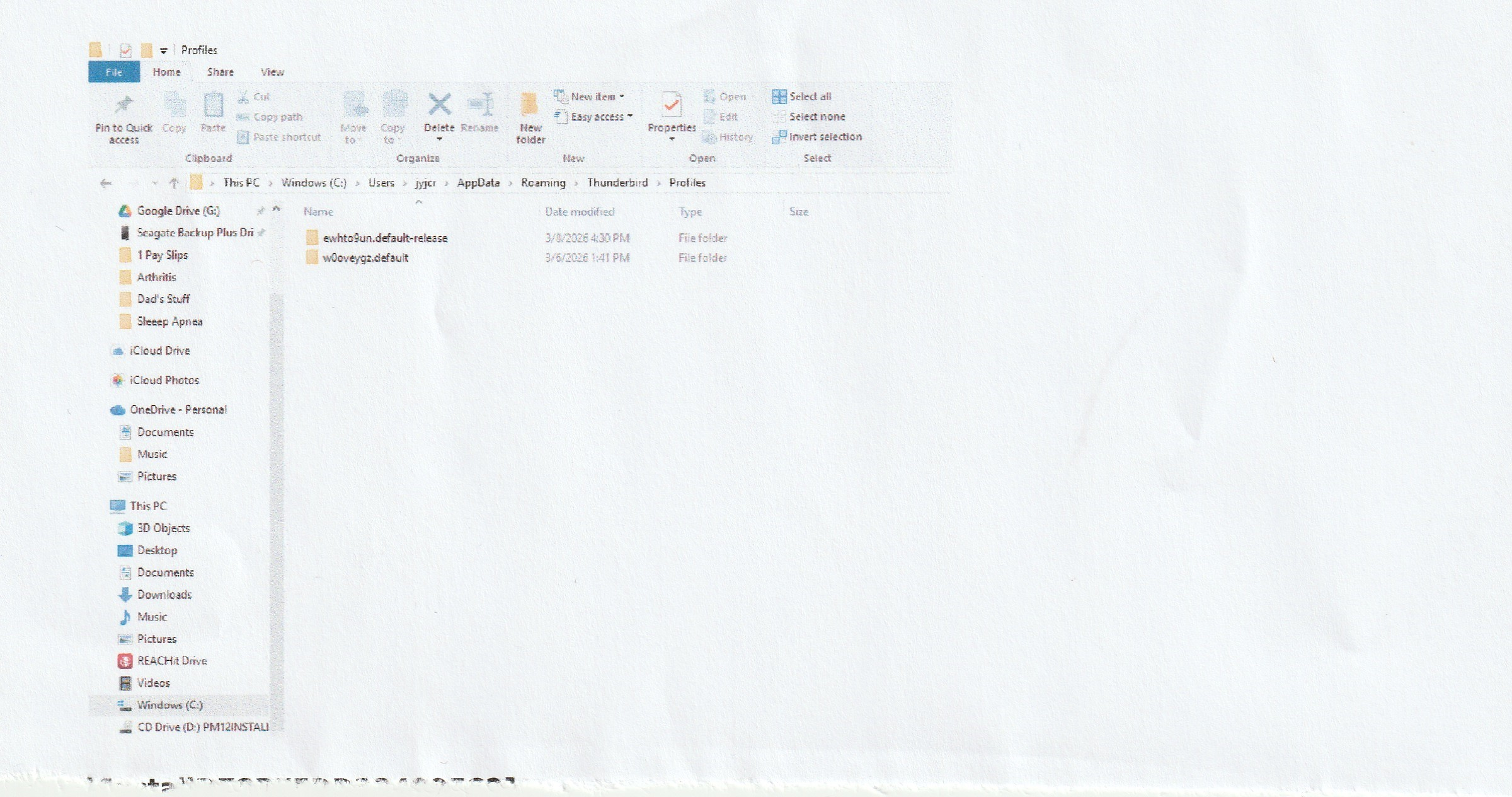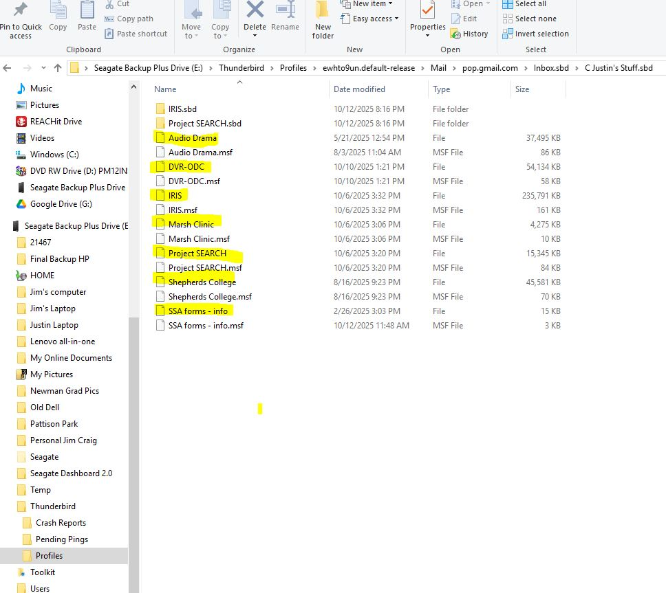 Thank you, hope is raising but first let's take a look at that saved copy of your profile folder on your external drive. Open ewhto9un.default-release, search and open the sub-folder ImapMail which should contain at least one account folder with a name such as "imap.xxx.xx" or maybe "secureimap.xxx.xx" Please show the contents of the "imap.xxx.xx" or "secureimap.xxx.xx" account folder