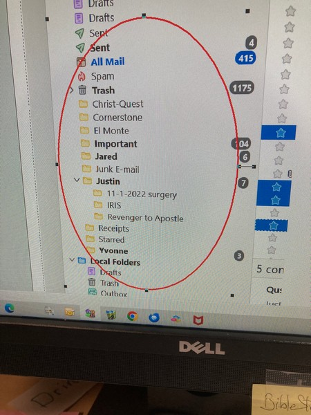 Since I don't know "the whole thing" please open both imap.gmail.... account folders one after the other and look for files with the names of "Christ-Quest", "Comerstone", "El Monte", "Jared", .... "Yvonne", which correspond to the folders shown in your first screen shot. Do this to identify which of the two imap.gmail.... account folders corresponds to the IMAP account shown in your first screen shot in which we see all the folders cited above. If you succeed to identify the "good" imap.gmail... account folder, please show a screen shot with ist complete contents.