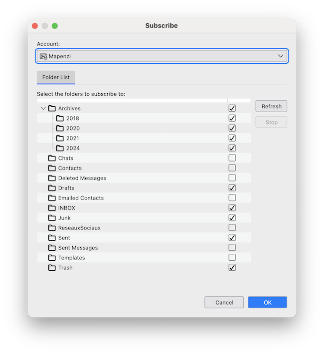 I opened the "Subscribe" window, and the missing folders were not there, only the folders in the screen shot that I sent to you.