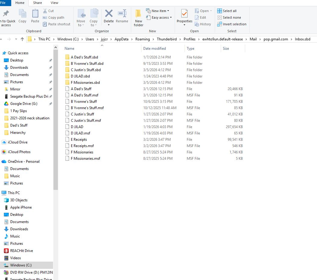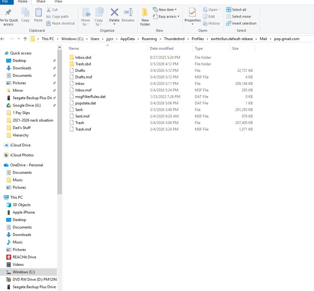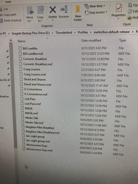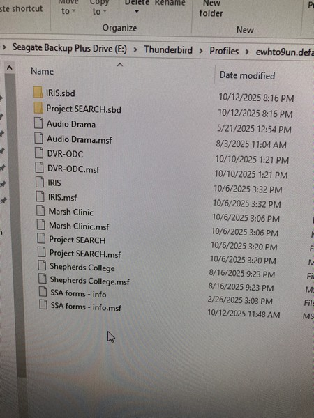 Your screen shots, done with a smartphone, are irritating since I cannot see neither the full path to the folder of which you show the contents nor the file size. So I have not the slightest idea to which email account all those files belong. The names of the folders shown in the image of your message from 3/9/26 don't appear in any of the new screen shots. Note that a message folder in Thunderbird is represented in the profile by a so-called mailbox file (text file without extension). To be able to help you efficaciously I depend on your info and above all on your screen shots. Without knowing where exactly are located all those files you show in four images I can't do anything to retrieve your missing folders.