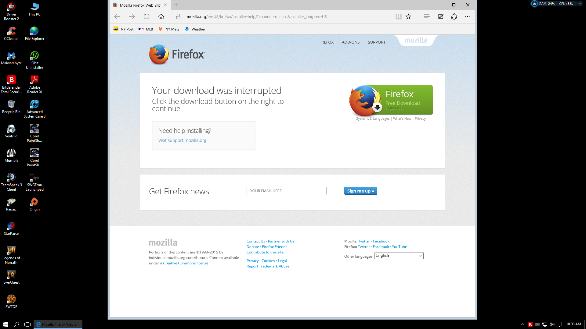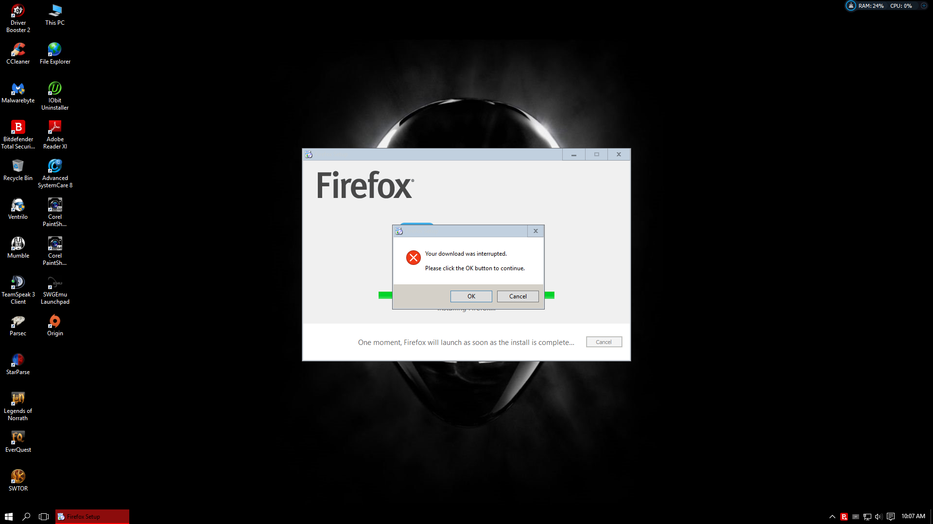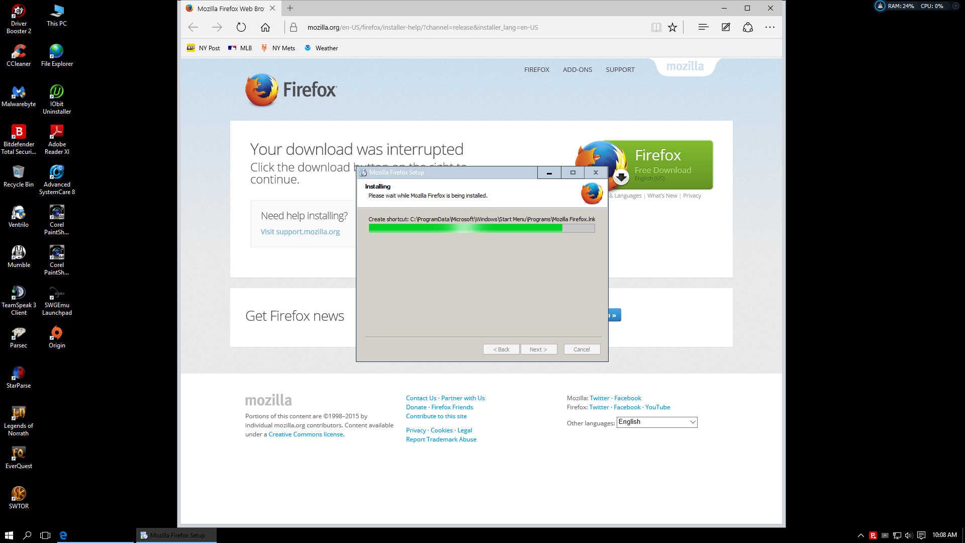 I am trying to install Firefox to Windows 10 32 bit and I get the stuck at the following step: