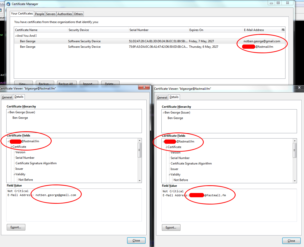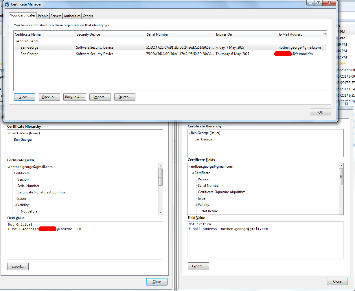 However, when I installed both sets of personal keys and inspected them, I see the following in the certificate viewer (see attachment). Even though they're linked to two different email addresses, the primary heading in the certificate viewer's tree is identical. However, strangely, this depends on the order the personal keys are installed in, it seems. If I install "Fastmail then Gmail" I see the data falling under the Fastmail heading. If I install "Gmail then Fastmail" I see the data falling under the Gmail heading (2nd attachment).