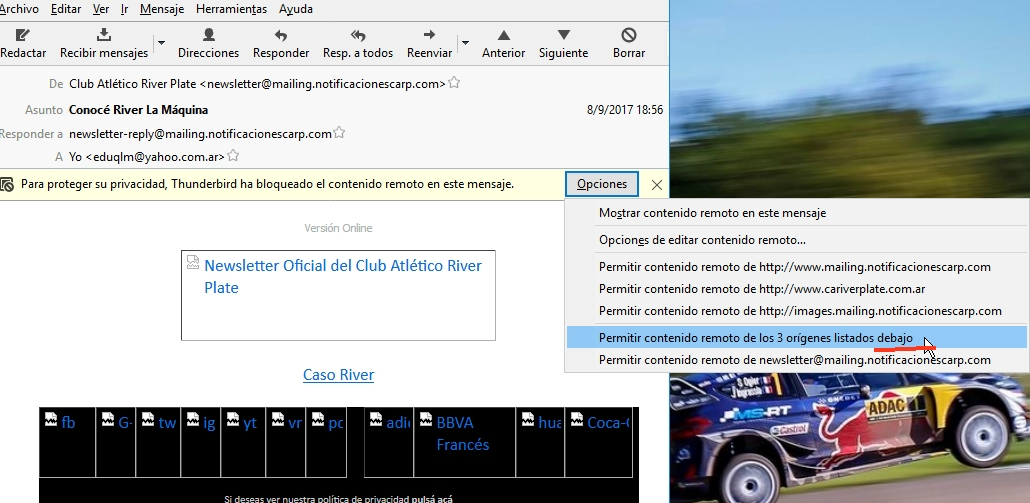 Para habilitar el contenido remoto de un mensaje en Thunderbird, voy a Opciones y ahí se despliega un menú que dice: "Permitir contenido remoto de los N origenes listados debajo" (siendo N la cantidad de origenes) Cuando debería decir: "Permitir contenido remoto de los N origenes listados arriba" (siendo N la cantidad de origenes) No se como dice el texto original en inglés, pero el correcto debería ser "above" y el incorrecto "below".