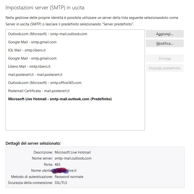 Non riesco a inviare dalla mail live , negli altri accont inseriti in tunderbird riesco ma non rieaco da live.it e non so come configurare il server psta in uscita