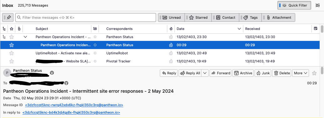 I am attaching two screenshots, the first shows a message received today that shows correctly (I am UTC+1, so 00:29 is correct). The second shows a message received an hour earlier where the date and received columns show 13/02/1403 at 23:30 instead of the correct value that appears in the Date header of the message of 02/05/2024 (all dates in DD/MM/YYYY because of my locale).
