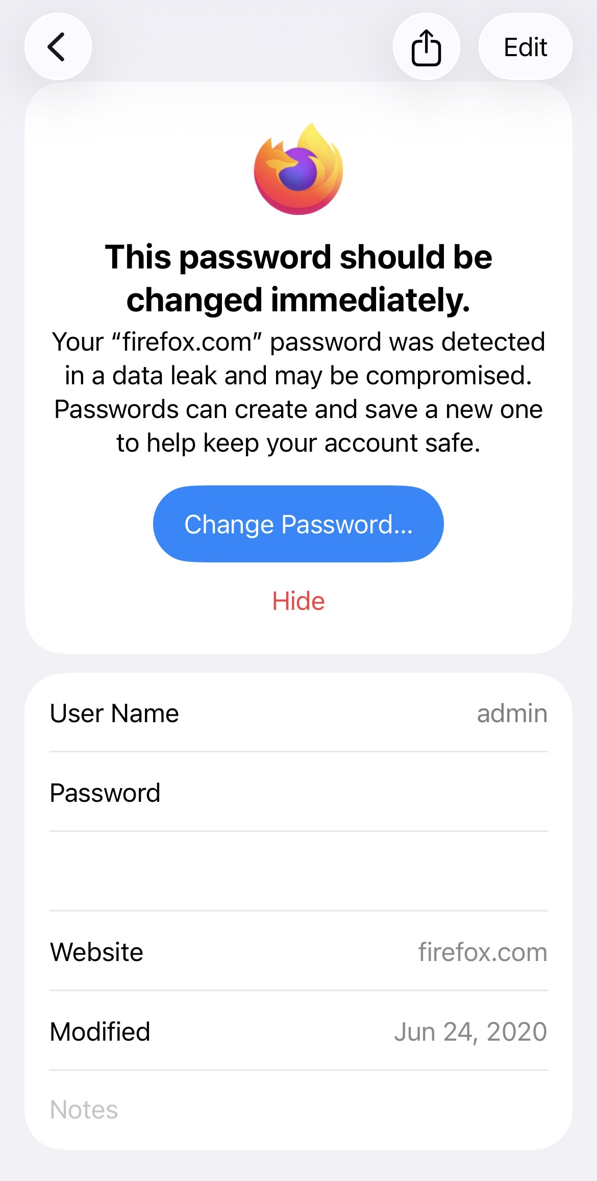 When I check my passwords I get a message saying that my password has been compromised and that the user name is admin. They suggest changing the password immediately but every time I try I can’t figure it out. I can change my password and have done so, but the admin password I’m not sure what to do.