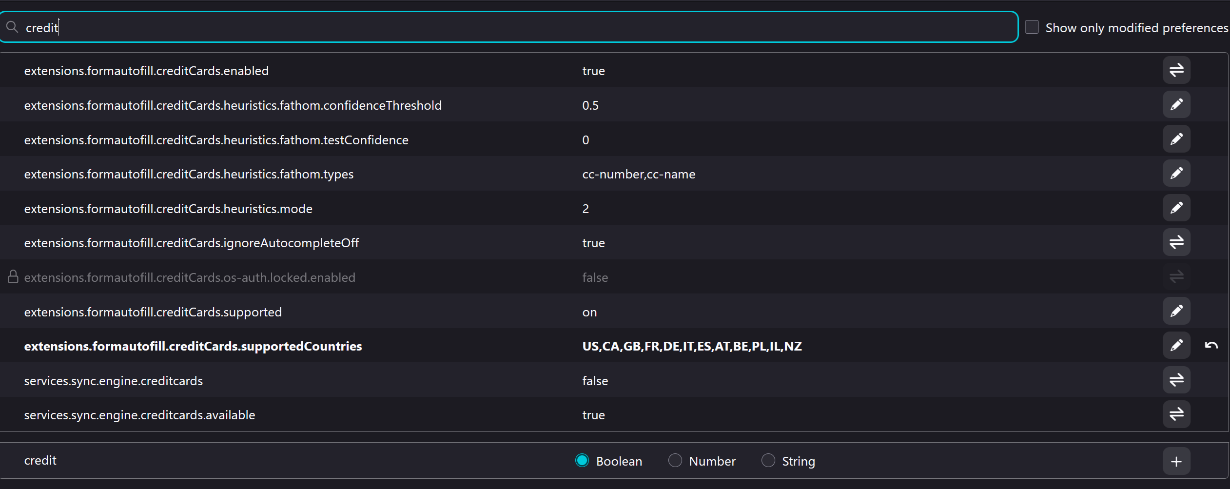 My credit card payment methods are missing from Firefox's settings. I tried enabling every relevant setting in about:config and still they won't appear. My current relevant settings are shown in the attached screenshot. any suggestions?