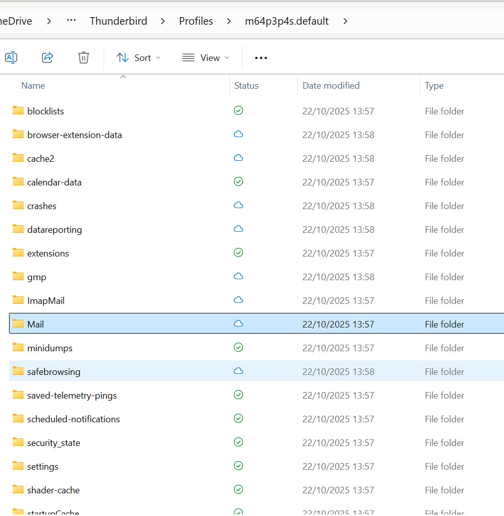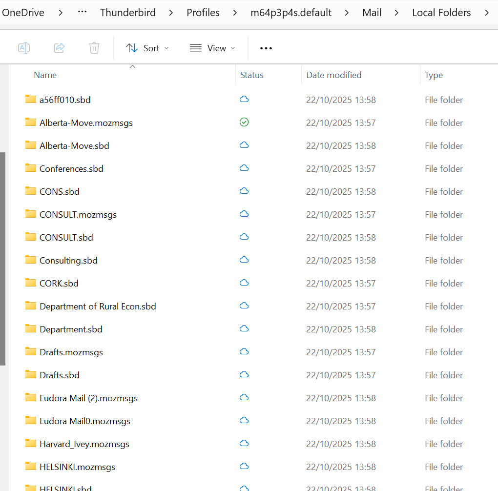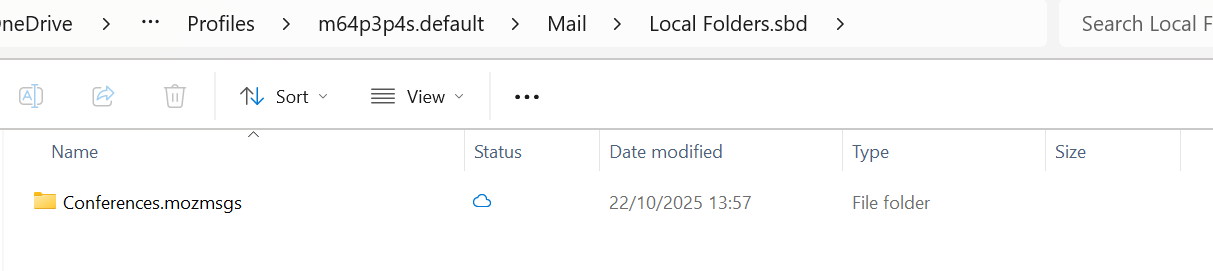 so, when I look on OneDrive, and I go my MAIL folder where I so far assumed to find (C:\Users\...\Thunderbird\Profiles\m64p3p4s.default), I find only a Local Folders.sbd that is basically empty (attached) => reminding me of Matt's message: "I just looked through all of the images you have posted and I saw not a single image containing the files necessary to populate a Thunderbird folder with emails."