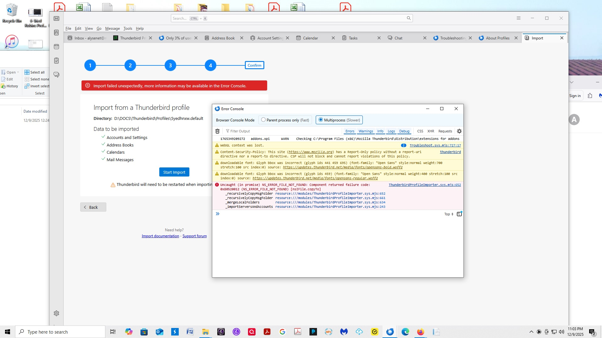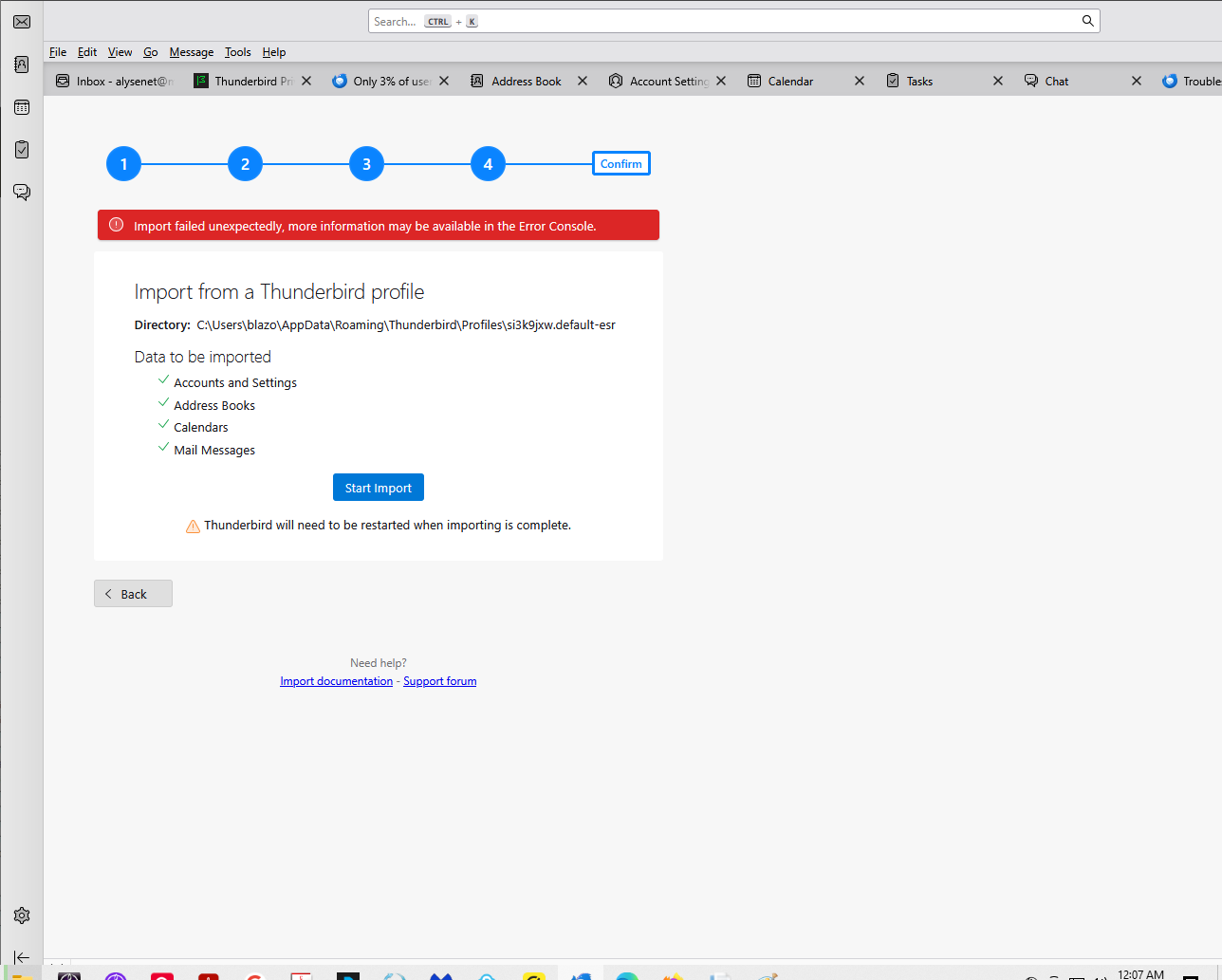 - Message telling me to see the Error Console. The message appeared right after I tried importing the profile that's stated in TBird's Troubleshooting Info "Profile Folder" path.