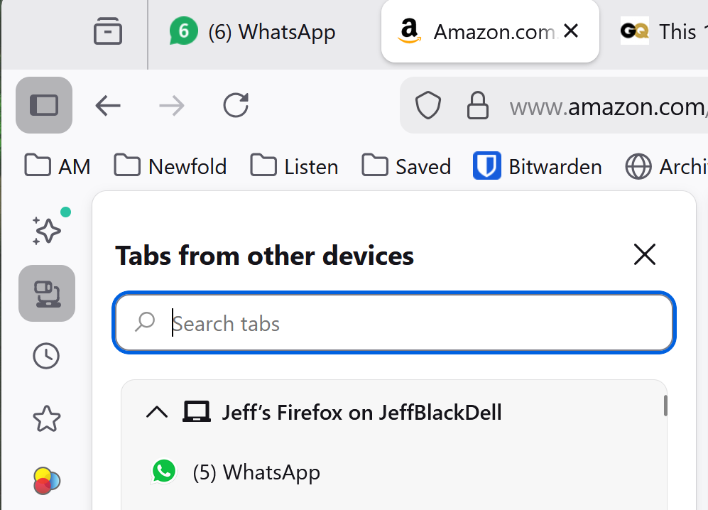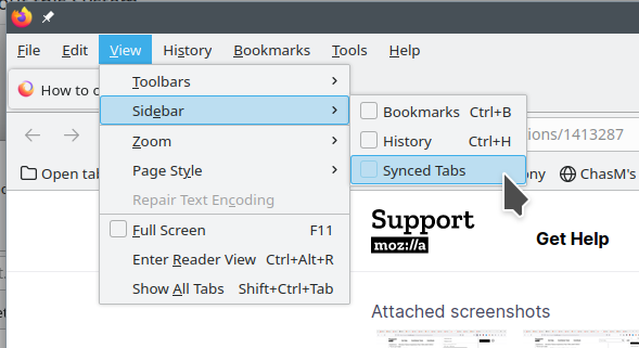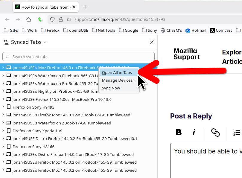 Yours shows "Synced Tabs, and mine shows "Tabs from other devices" (see screen shot). I was using 146.0 on Windoze 11, and it's no different on 146.0.1, and the laptop in question is "managed" by corporate IT, so I cannot install another version. I am a little suspicious now that I'm doing something wrong, and there is some other place I should be, other than clicking on the sidebar button? Or more likely, when they changed the popup header they also broke the right-click menu?? Maybe I need to wait for a later update? In the almost 20 years I've been using FF (since v2, IIRC), this might be my first bug report.