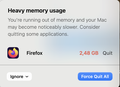 While running Firefox on MacBookAir with macOS 15.7.2 to browse simple websites I keep getting the below warning message. I may have 2 or 3 other apps open (like Apple Mail, MS-Word, Preview). "Heavy memory usage You're running out of memory and your Mac may become noticeably slower. Consider quitting some applications. Firefox 2,48 GB" So I quit Firefox to re-open again and continue my work. Does somebody has an hint where this message can come from ? Any settings to change on my MAC ? Thanks for helping