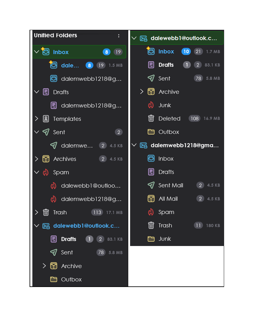 Using Unified Folders option. Not sure what all the folders in the list represent, but these two SENT folders don't seem to be syncing. Why are these files diaplayed (> dalewebb1@Outlook.com and subfolders). Should the stuff they contain be in the UNIFIED folders? As usual, I'm confused. Thanks,