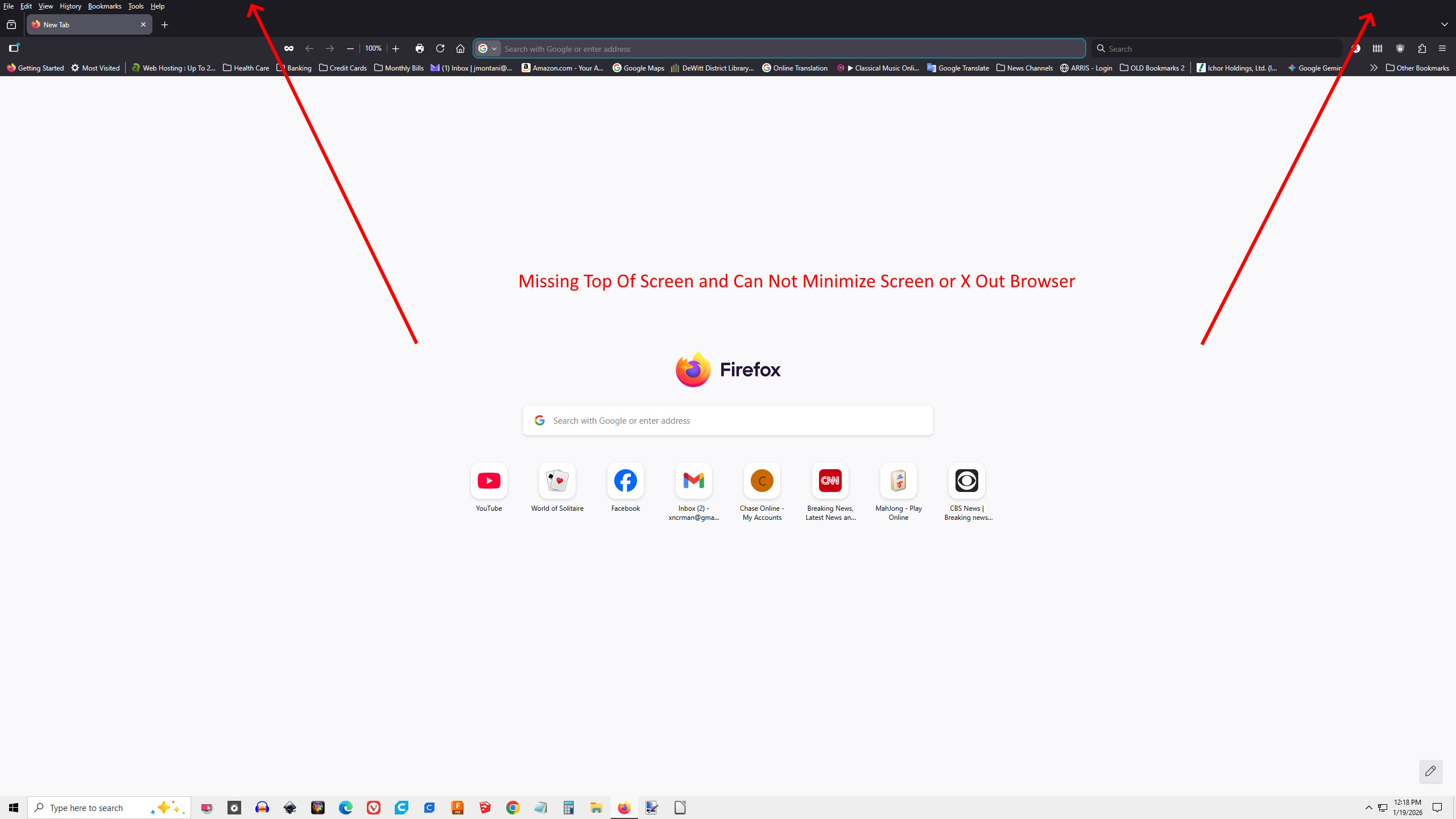 Please view screen captures that best show the random issues I have with Firefox browser. This started a few months ago on my desk top PC. I have kept my Firefox up to date using 147.0.1. and still run WIN 10 Home. Although I am sure Linux is in my future!