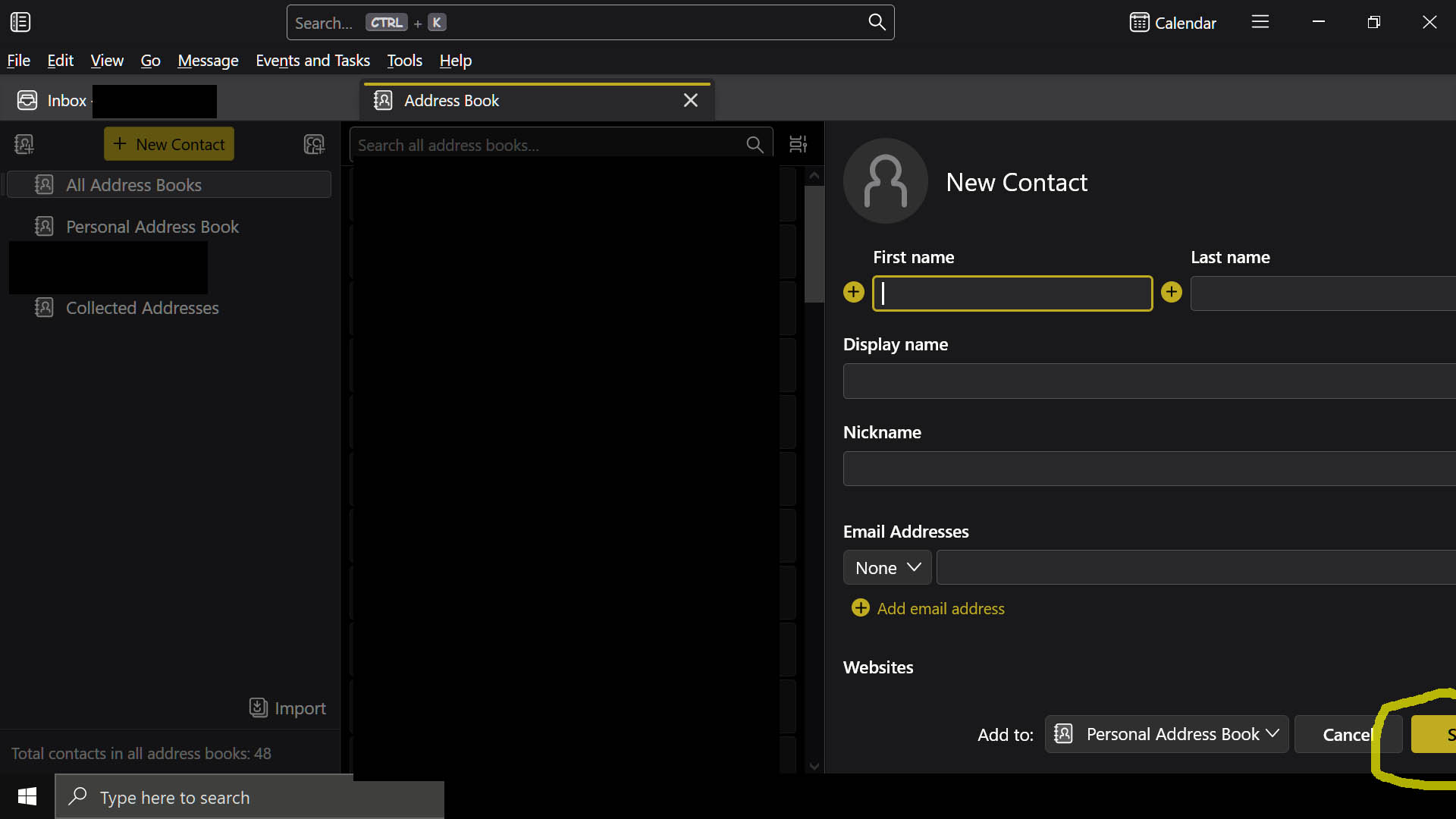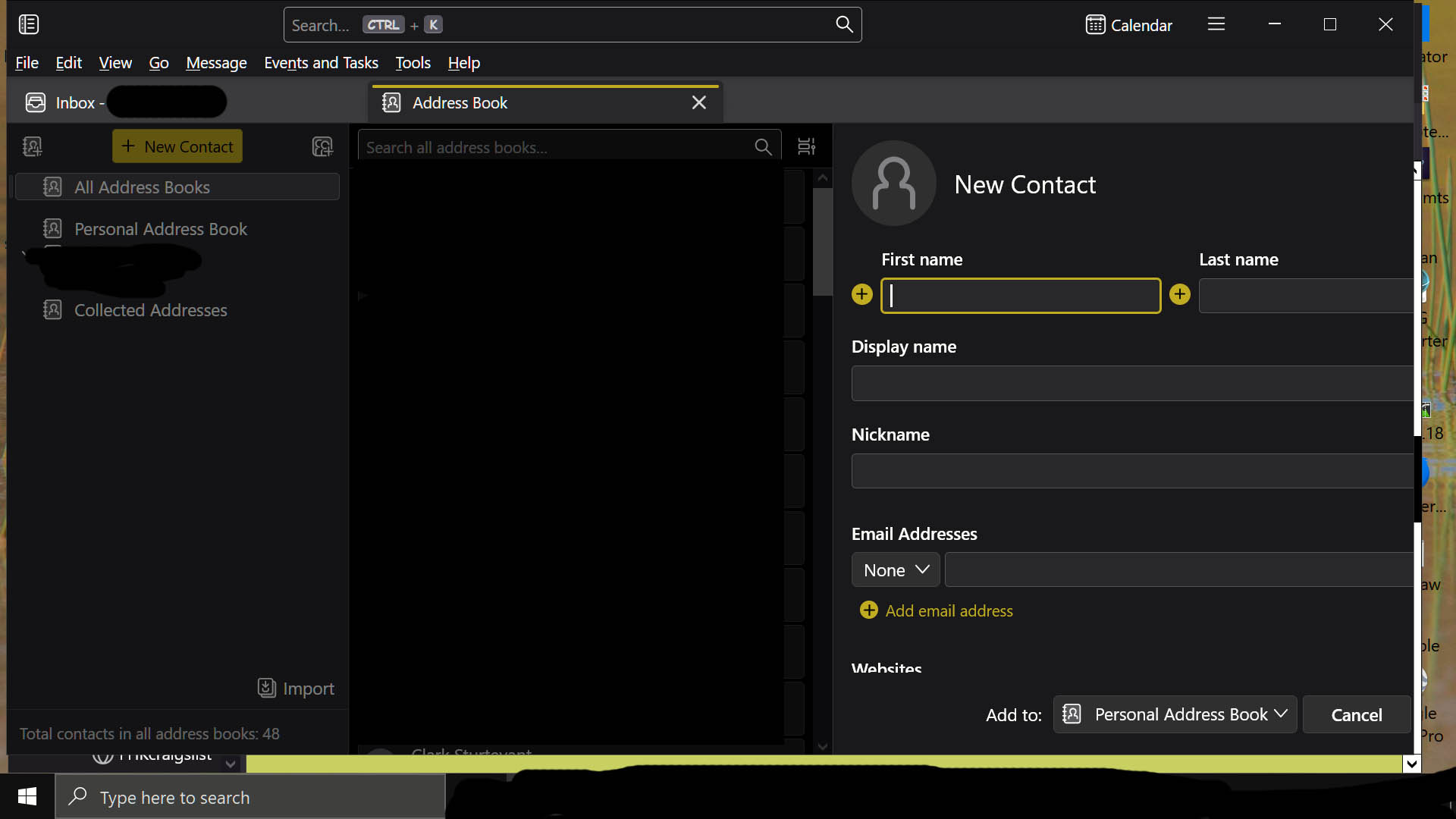The ability to select "Done" for New Contacts is totally off-screen on the right when using part-screen (screenshot2 below). When in full screen only a part of the box is available to complete and entry (screenshot1 below). I've tried adjusting font size and other stuff in Windows 10, but nothing changed the way the Thunderbird looks in this regard. Frank